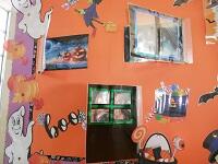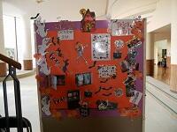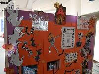 1階の階段わきには、ALTの先生が運用している英語に関する掲示板があります。今日は、ハロウィンに向けた内容の掲示物に貼りかえられました。