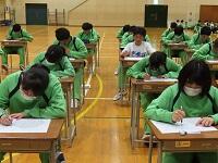 放課後の時間を活用して「第2回漢字チャレンジ大会」(回数は昨年度からの通算です)を講堂で開催しました。今回の大会では、校内の生徒に加え、北村小学校、広渕小学校からも児童が参加し、総勢90名近くが熱戦を繰り広げました。小学校は前回同様にオンラインでの参加です。ルールは3人一組のチーム戦で、チーム全員の合計点数を競う形式です。今回は出題範囲を漢検5級相当(小学校6年生までの漢字)としていますが、頭を悩ませる場面や果敢に挑戦する姿が多く見られました。大会の冒頭には、参加チームによる意気込み発表が行われ、「漢字は苦手だけど精一杯頑張ります」「絶対100点を取ります!」「優勝狙っています!」など、頼もしい言葉が次々と飛び出しました。どのチームも終始集中して取り組み、講堂は静かな緊張感と熱気に包まれていました。今回は児童だけでなく、教員も1チームが参加し、共に問題に挑戦しました。生徒と教員が一緒になって学びに向かう様子は、とても印象的で、全体の意識の高さを感じさせる大会となりました。多くの生徒の学びに対する意識の高さが素晴らしいと感じました。今後も、このような学びの姿勢を大切にしながら、更に学習意欲の向上につなげていきたいと思います。生徒の皆さん、お疲れ様でした。結果発表は後日行われますが、どのチームが栄光を手にするのか、今からとても楽しみです。
